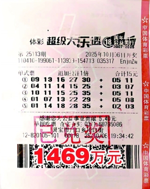 本报讯(记者 张瑜)金秋十月,硕果盈枝。10月6日开奖的中国体育彩票超级大乐透第25113期,一位来自灵宝的幸运购彩者成功揽获1469.8万元巨额头奖,中奖者难掩激动之情,表示将合理规划奖金使用,并与家人共享喜悦。从摇奖设备的严格检测到开奖过程的全程公证,再到奖金的准时足额兑付,体彩的每一次开奖都成为一场阳光下的盛典,让每一份幸运的降临都真实可信。