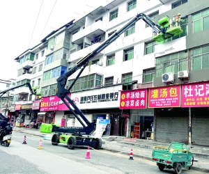 近日,卢氏县为居民楼加装保温材料,用心用情用力办实事,让老百姓过上“暖冬”。图为该县城关镇西大街施工场景。郭文龙 摄影报道