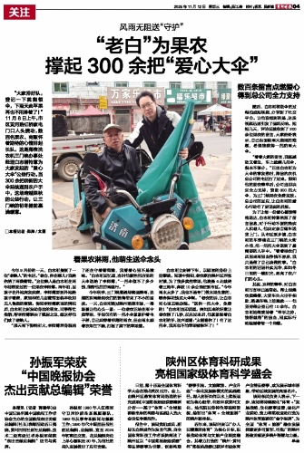 为了让每一份爱心都能精准送达,白志刚特意梳理了留言信息,对于行动不便的残疾人和老人,他决定亲自驱车送货上门。从市区到乡镇,白志刚的车穿梭在三门峡的大街小巷,把一把把大伞送到了最需要的人手中。“看着果农们风里来雨里去挣钱不容易,我只是做了自己该做的事。”白志刚的话语朴实无华,却如冬日里的一缕阳光,照亮了农户们的心头。
