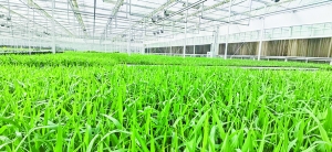 金色的阳光透过玻璃棚顶洒在青翠欲滴的芦竹、生菜等种苗苗床上,几百万株芦竹幼苗和菜苗整齐划一、富有生机,仿佛能看见它们正忙着发生光合作用、集聚生长能量;而苗床的下边,则是长而浓密的根须,正在汲取液体中的营养,茁壮成长。大棚中电子屏显示着实时温度、湿度、气压等指标数值。占地17280平方米的智能温室内,管理人员正忙着记录各种生产数据。这是11月19日,记者在位于卢氏县横涧乡营子村的和仲后稷(卢氏)智能科技公司植物工厂示范园看到的景象。