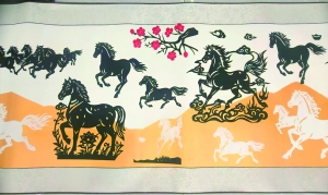马年春节期间,三门峡市级非遗剪纸传承人文欢欢创作的长达12米的《百马迎春》剪纸图在河南省文化馆参与马年生肖主题展览,上百匹骏马恢弘大气、形态俊朗,受到观展市民一致好评。