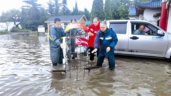 7月24日,三门峡市突降大雨,陕州公园东门路面积水严重,该公园及时组织工作人员打开窨井盖,放置警示笼,并安排专人值守,加快积水排放速度,确保游客和公园环境安全。 本报记者 单义杰 摄