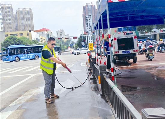 为消除强降雨对三门峡市道路通行的影响,从7月24日下午开始,三门峡京环公司全员全车集体出动,对市区道路上的枯枝落叶、积水淤泥进行清理、冲洗,确保路畅人安。 本报记者 尤中轩 摄