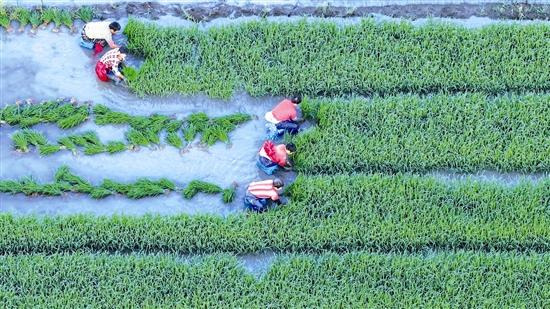 7月30日,在浙江省台州市路桥区横街镇田间,农民们忙着拔秧苗备插秧(无人机照片)。