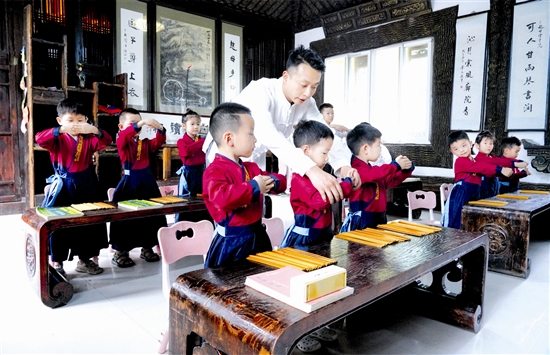 近日,在甘棠书院国艺传承班上,老师带领孩子们学习传统礼仪,诵读国学经典,让孩子们在传统文化的熏陶中成长为有内涵、有素养的新一代。图为老师教孩子们行拱手礼。 本报记者 夏泽辉 摄