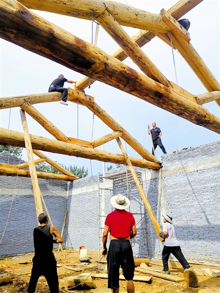 7月25日,在“中共豫西二地委渑池纪念馆”旧址修复工地,工人们加紧施工。