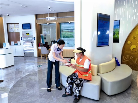 “迎进门”享清凉。该行在营业大厅设立“农情暖域”服务驿站,配备饮用水、防暑降温药品,在显著位置设立告知栏,并邀请周围的环卫工人及老年人到大厅饮水、歇脚,让广大户外劳动者真正感受到关爱和尊重。