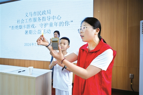 近日,义马市民政局社会工作服务指导中心开展“拒绝烟卡游戏,守护童年的你”暑期公益活动,呼吁广大青少年远离“烟卡”危害,同时向家长科普“烟卡”的危害及预防处置方法,并联合相关职能部门共同开展校园周边“净烟”专项活动,收效显著。 张春光 摄