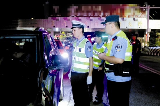 连日来,根据全国公安机关夏夜治安巡查宣防集中统一行动安排,三门峡市公安局组织警力加大对人员密集区域和交通要道的检查和巡防力度,全力营造安全稳定的社会治安环境。图为8月9日夜间,民警在国道209线黄河大桥检查站查控过往车辆。 王峰 摄