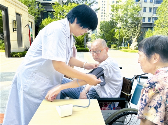 8月31日,市区金渠国风苑小区物业邀请医疗机构到小区开展义诊活动,为小区居民送上健康大礼包。据了解,此次义诊为小区居民免费提供测血压、测血糖和健康知识讲解等服务,受到小区居民的欢迎。 本报记者 梁如意 摄