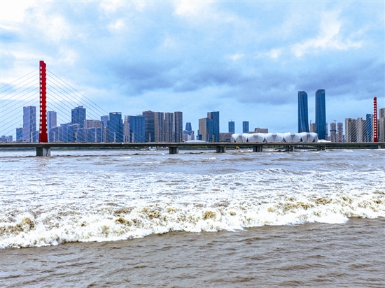 每年中秋节前后是钱塘江潮水的最佳观赏期。当钱塘江大潮经过杭州市区时,潮水、大桥与两岸林立的高楼组成了壮观景象。 新华社记者 江汉 摄