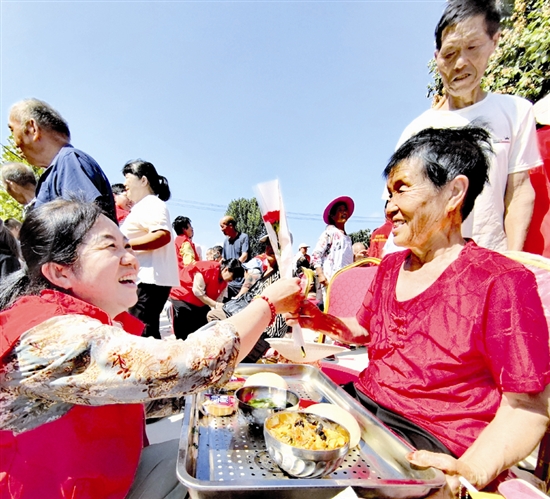 9月17日,灵宝市焦村镇沟东村举办“花甲宴孝亲”活动,村里子女向父母敬鲜花、送蛋糕、看大戏,陪老人度过欢乐时光。