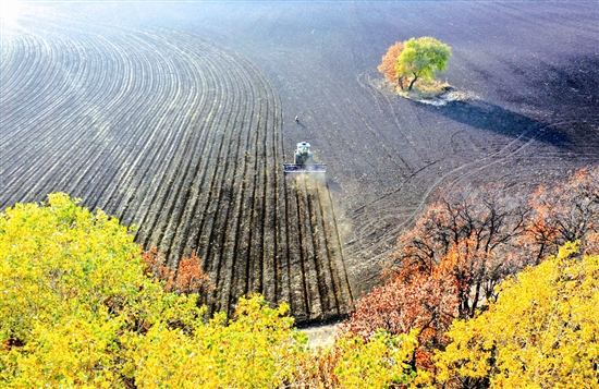 10月16日,黑龙江北大荒农业股份友谊分公司大马力拖拉机在进行坡耕地等高种植秋起垄作业(无人机照片)。