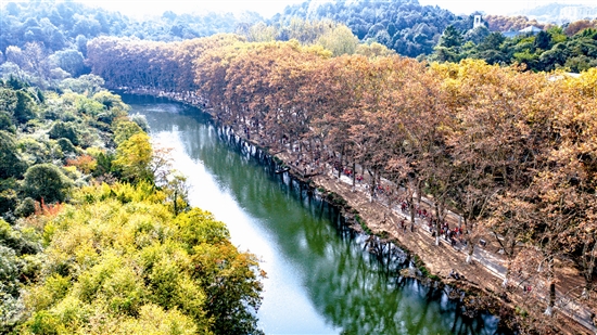 贵阳市花溪国家城市湿地公园黄金大道风景一隅(10月27日摄,无人机照片)。