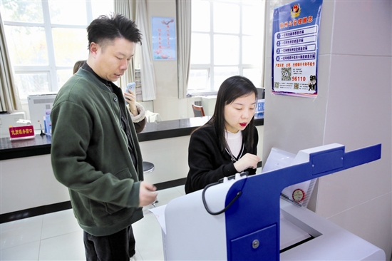 近年来,市市场监管局陕州分局持续优化营商环境,全面推行个体工商户注册登记智能审批。办事群众利用智能自助审批系统设备,自助办理、自助打印,大大缩减了办理时间,提高了行政效能。图为日前,市场监督管理登记窗口工作人员在引导群众快速办理营业执照。 本报记者 王建栋 摄
