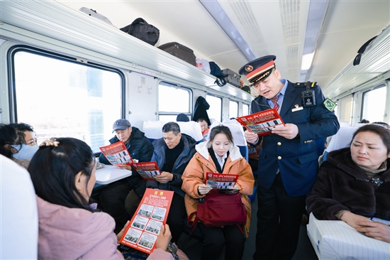 12月4日,在齐齐哈尔开往合肥的T244次列车车厢内,列车长为旅客讲解招聘信息。