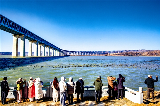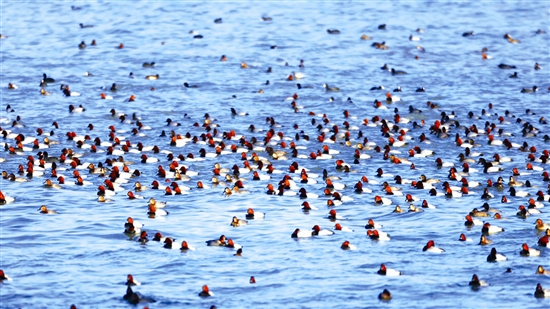 日前,三门峡黄河湿地陆续迎来候鸟迁徙高峰,吸引了大批鸟类前来栖息越冬。在沿黄生态廊道陕州区段,上万只越冬的红头潜鸭在这里自由栖息觅食,吸引游客拍照打卡。据悉,每年秋冬交替之际,红头潜鸭都会从新疆千里迢迢来到三门峡,与大天鹅相逢在黄河岸边,与冬日的清水黄河构成一幅人与自然和谐共生的美丽画卷。 本报记者 李鹏 摄