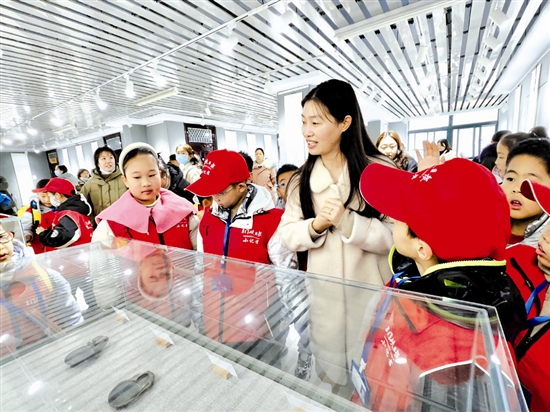 12月21日,三门峡日报小记者来到陕州区文化馆,欣赏画展,体验拓印,提升鉴赏美、创造美的能力。图为陕州石壕窑陶瓷烧制技艺市级代表性传承人邓晓荣为小记者讲解陶瓷烧制技巧。 曹嘉琦 摄