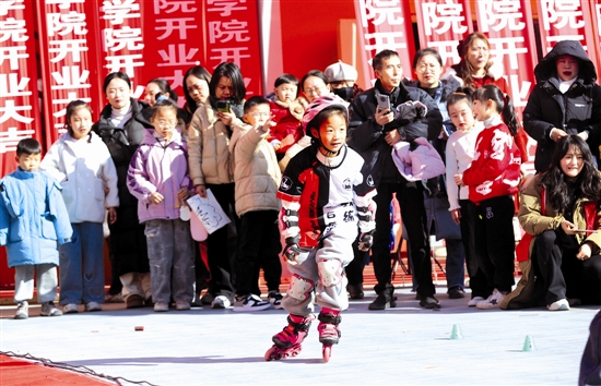 12月22日,学生在参加轮滑竞技表演展示。近年来,我市坚持秉承“运动、健康、快乐”的体育理念,通过轮滑、足球、篮球、乒乓球、网球等体育项目丰富学生课外生活,帮助孩子们强健体魄、健康成长。 本报记者 郭丽 摄