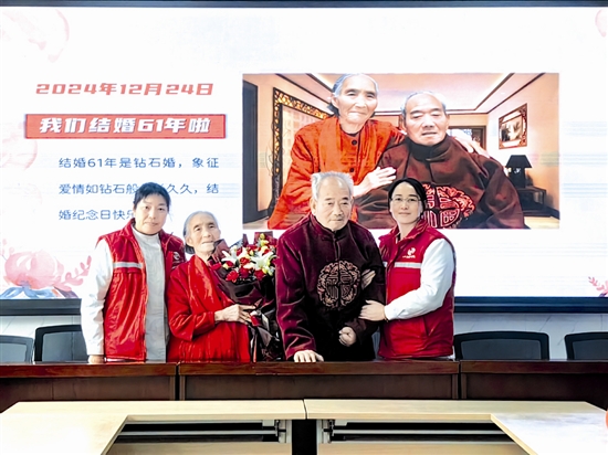 12月24日,居住在灵宝市函谷关镇卫生院老年康复护理中心的一对老年夫妇迎来了他们第61个结婚纪念日。为了弥补家人不在身边的遗憾,工作人员为他们“秘密”准备了一个温馨的小型庆祝仪式,为他们送上特别的祝福。 王玉沛 摄