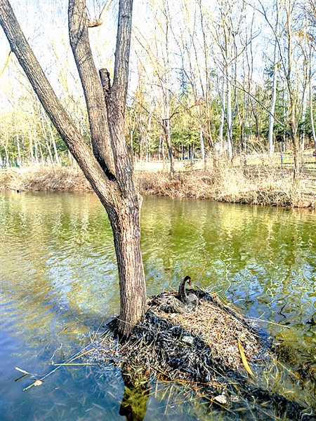 2月26日,在三门峡天鹅湖国家城市湿地公园内,一只黑天鹅成功产蛋后,在原地安静守护。近年来,我市持续改善湿地生态环境,为大天鹅等候鸟提供良好栖息环境。 本报记者 孙猛 摄