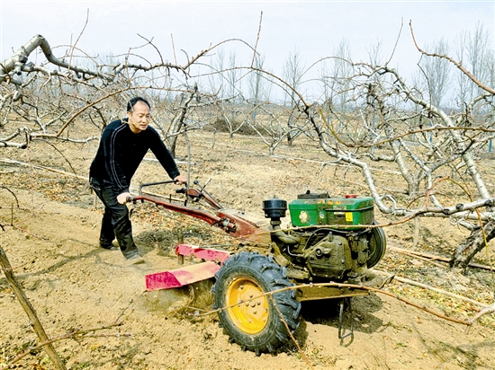 日前,在“苹果之乡”灵宝市田间地头,果农抓住当前气温回升的有利时机,迅速开展果树修剪、施肥、深翻等工作,为今年苹果丰产打下坚实基础。图为故县镇城东村群众在进行果园翻耕。 邢博 摄