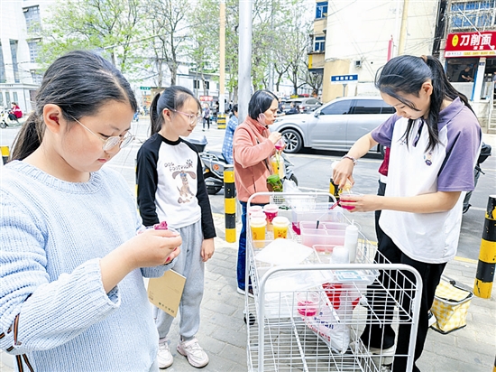 近日,三门峡市第三实验小学组织学生走出校园开展社会实践,秉持自立理念,从原料准备、摊位布置到奶茶制作、售卖,全程由学生自主筹备。活动中,学生严格把控产品质量,以热情礼貌的态度待客,将课堂知识融入生活,生动展现了“三自”教育的独特风采与育人成效。图为售卖奶茶现场。 杨光 董晓阳 摄