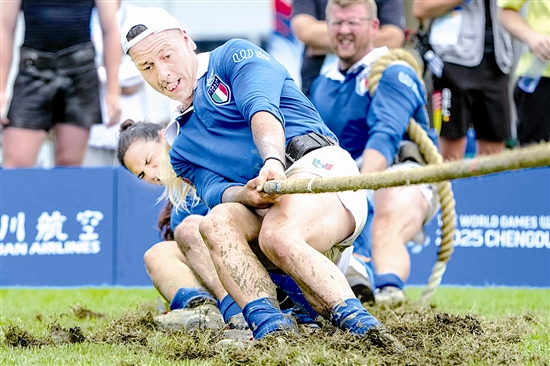 图③8月11日,意大利队队员在铜牌赛中。最终,意大利队获得第四名。当日,2025年成都世运会混合室外拔河580公斤级比赛在东安湖体育公园中央广场举行。 新华社记者 李博 摄