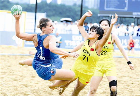 图②8月11日,中国队球员昝惠(中)在比赛中防守克罗地亚队球员洛帕奇-什克里尼亚尔。当日,在2025年成都世运会沙滩手球女子第5—8名安慰赛半决赛中,中国队2比0战胜克罗地亚队。 新华社记者 刘坤 摄