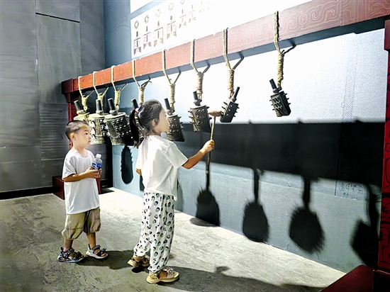 8月10日,在三门峡庙底沟博物馆“古虢重光——三门峡虢国考古成果特展”现场,孩童挥动木槌敲奏虢季墓编钟复制品,体验古代礼乐文明的独特魅力。 本报记者 宋杰 摄