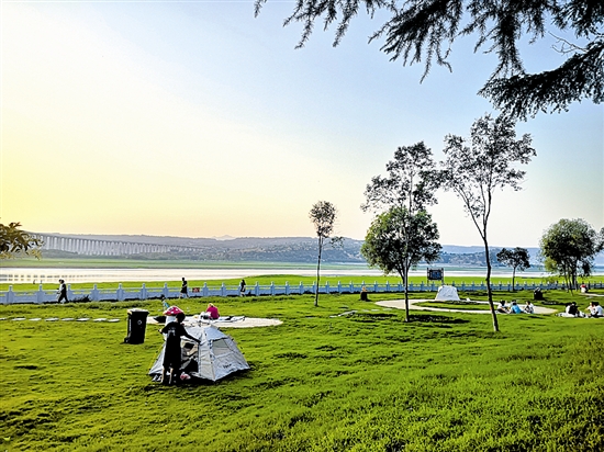 夏季的夜晚,河畔露营地、万亩荷塘、时光隧道等成为市民避暑纳凉的好去处。“大家都说黄河是‘母亲河’,厚重又庄严,但喝着咖啡看着她,更觉得黄河像是一位鲜活的朋友。”市民李琪说,“黄河会在汛期前带着泥沙奔腾,告诉我们生命要有力量;也会在枯水期时露出浅滩,让我们看见水下的坚韧。她教会我们,‘风景’不止眼前看到的美,更是自然与生命的对话。”