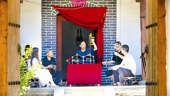 8月16日,在卢氏县潘河乡冠云村,民间艺人趁农闲时间相聚在一起,练习锣鼓书技艺。近年来,卢氏县不断加强非遗文化传承保护力度,推动了民间文化艺术发展。 聂金锋 摄
