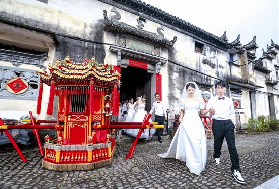 近期,浙江省诸暨市东白湖镇举办“穿越千年 爱在东白”七夕民俗文化旅游系列活动,通过举办集体婚礼、传统婚俗展、“一村一品”共富市集等形式,让游客感受传统文化、践行文明婚俗礼仪。 新华社记者 徐昱 摄