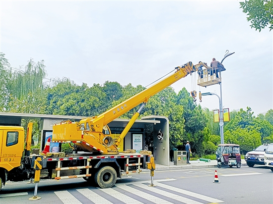 9月16日,在三门峡市区河堤路,工作人员借助工程车在高空作业平台仔细操作,对太阳能路灯进行维修,保障路灯正常照明,为市民出行保驾护航。 本报记者 张明 摄