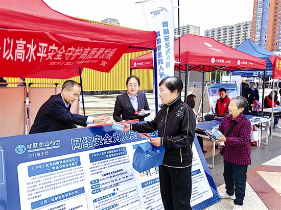 9月19日,农业银行三门峡分行在湖滨广场开展国家网络安全宣讲周金融主题日活动。工作人员对群众关心的金融理财、反假币、反金融诈骗等问题答疑解惑,提醒群众树立正确的理财观念,警惕非法集资陷阱,提高自我保护能力。图为工作人员向过往群众发放宣传折页。 张冲波 任江波 摄