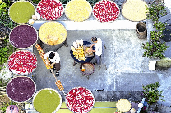 时值秋收时节,村民们利用晴好天气,将辣椒、玉米、山核桃等农作物晾晒在房前屋后,形成独具特色的“晒秋”景观。