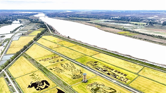 这是9月22日在内蒙古准格尔旗拍摄的黄河岸边的稻田画(无人机照片)。