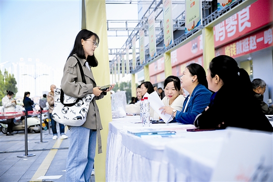本次招聘活动吸引60余家企业参加,招聘会采用“线下招聘+直播带岗”模式,提供1800多个岗位,吸引求职者1万余人,初步达成就业意向100余人。图为求职者在了解岗位情况。 本报记者 王建栋 摄