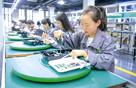 10月9日,工人在河南省洛阳市伊滨区一家新能源汽车充电桩生产企业车间忙碌。