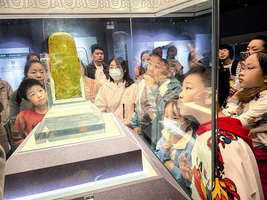 “双节”期间,三门峡市虢国博物馆迎来参观热潮,许多青少年在家长的陪伴下,跟随着志愿讲解员的脚步,聚精会神地聆听讲解,在一件件珍贵文物与一段段历史故事中,深入了解虢国灿烂的文明与厚重的历史文化。 本报记者 程倩 摄