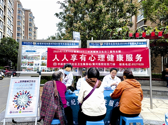 10月9日,湖滨区涧河街道中原世纪苑社区卫生服务站(黄河三门峡医院社区门诊)专业团队走进居民小区开展义诊活动,将心理健康服务送到群众“家门口”。图为当日活动现场,医护人员为居民提供医疗服务。 周兰静 摄