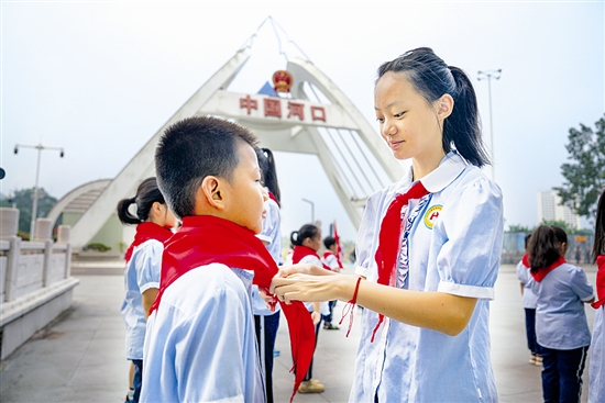 10月13日,在云南省红河州河口县,河口国门小学少先队老队员为新队员佩戴红领巾。