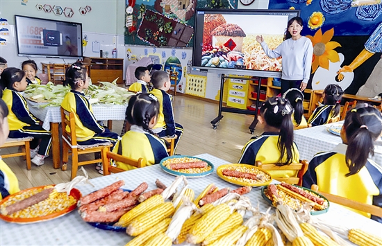 10月14日,河北省唐山海港经济开发区幼儿园老师对小朋友进行珍惜粮食教育。