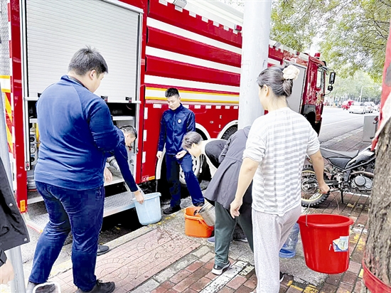 10月8日上午,抄表员在三门峡市区锦绣嘉苑小区发现水表异常。三门峡市隆祥物业管理有限公司迅速行动,联系市自来水公司、市规划勘测设计院前来支援。原来系该小区主水管道漏水所致。湖滨区消防大队紧急派车送水,保障小区600余名居民基本生活用水。在多方协作下,主水管道抢修完成并恢复供水。图为消防车为居民提供临时用水。 本报记者 张明 摄