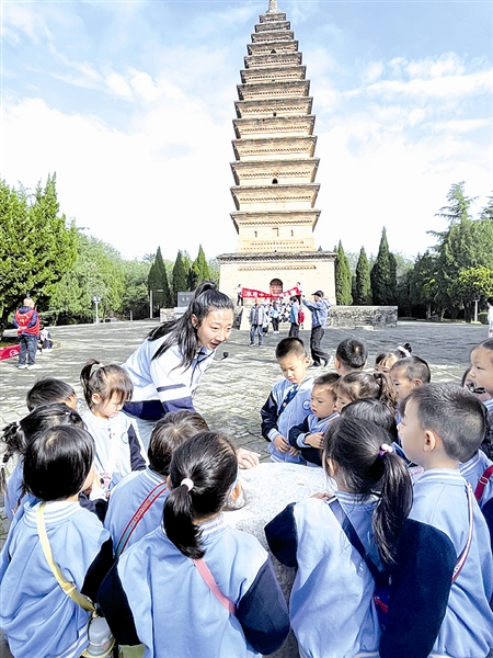 10月14日,中国水利水电第十一工程局幼儿园组织孩子们前往陕州公园宝塔苑,参观宝轮寺塔,为孩子们带来一堂生动的家乡文化启蒙课。活动中,孩子们在老师的带领下近距离接触宝轮寺塔,了解家乡历史,种下“爱家乡”的种子。 丁蔷 刘月娟 摄