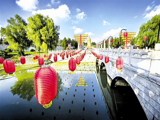 灵宝市函谷关历史文化旅游区串串红灯高悬,朵朵白云飘浮在天空,秋高气爽好时节,出游赏景正当时。