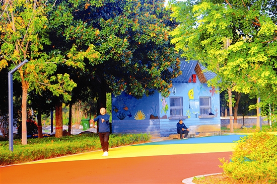 陕州区甘棠公园里,秋水渐寒,亭台静默,树木已被秋霜悄然染黄。金灿灿的叶片在阳光下摆动,与蓝天碧水共同构成一幅静谧清幽的园林秋景图。