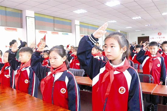 10月13日上午,陕州区一中小学部举行“强国复兴有我 争当新时代好少年”庆祝中国少年先锋队建队76周年主题队日活动。图为在大队辅导员老师的带领下,学生高举右手,庄严宣誓。 卫晓辉 秦敏 摄