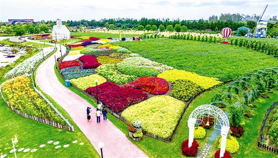 10月19日,游客在江苏省盐城市大丰区荷兰花海景区内赏花游玩(无人机照片)。