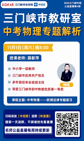 公益直播课每周一期,将针对中考各科重难点进行答疑解惑。各位老师、家长、学生可识别左下方二维码加“2026三门峡中招君”为好友,进群听课。本周六晚8:00,不见不散。 (本报记者)